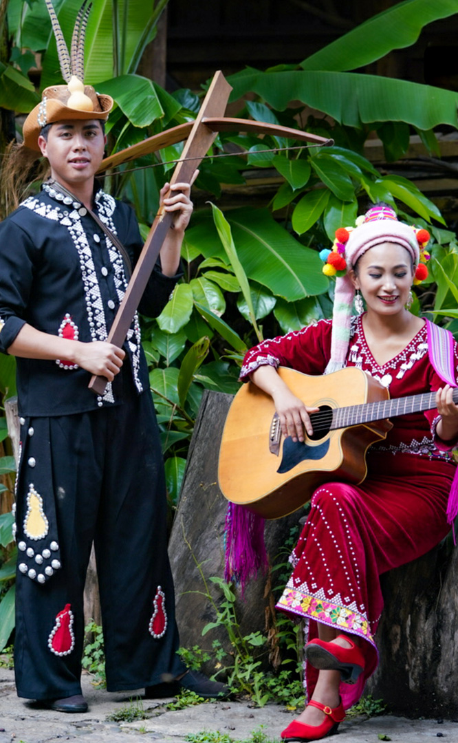 德昂族人口約1.7萬,主要分布在德宏州和保山市的潞西、梁河、瑞麗、隴川、隆陽等縣區(qū)。民居多為草排覆頂竹木結構的干欄式建筑,眼前的德昂村建筑納入了能容納數(shù)十人居住的德昂大房子,氈帽頂?shù)男》孔樱€有頗具浪漫色彩的大公房、小公房……還建有“龍陽塔”標志及佛教奘房、佛塔。德昂族民間普遍信奉南傳佛教,民俗活動與佛事活動關聯(lián)緊密。潑水節(jié)、開門節(jié)、關門節(jié)是重大節(jié)日。德昂族服飾色彩豐富,口頭文學特別是民歌創(chuàng)作活動...